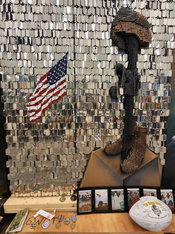 Chief Joe Pisano and former Army Ranger Chad Jenkins discussion the significance of the Corrugated Wall in Joe's Art of Immortalizing Heroes exhibit. Each star in the piece represents a veteran's sacrifice.