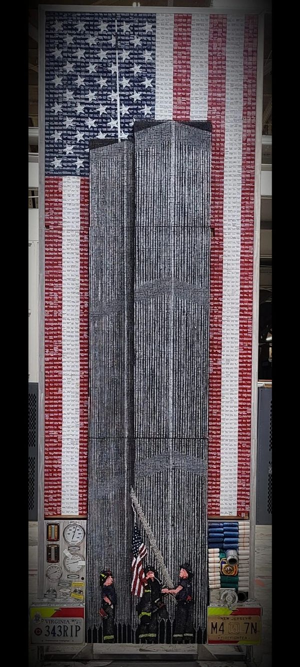 Materials used in this work include: 30,000 drywall and trim screws, 2,978 blocks of wood, representing the lives lost in the Twin Towers, and gauges and parts from a decommissioned firetruck.