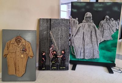 "My top priority and initial challenge for [the] 9/11 piece was creating an image that would not open wounds or deepen the wounds already struggling to heal. I am very pleased with how the piece turned out. I feel I accomplished this and to top it all off I created this piece in my hotel room.