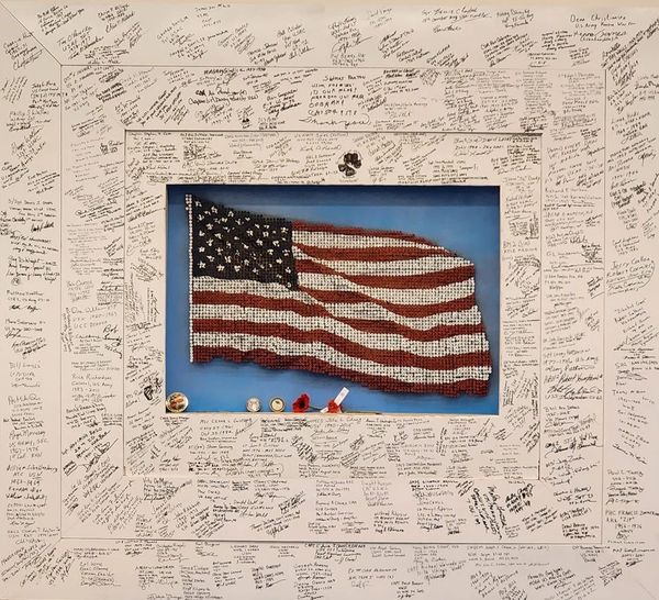 "After the piece was completed, I decided on the name "Stand Together" because I wanted the artwork to symbolize how all branches of service stand together in unity to fight for freedom and the ideals that the flag represents. I then came up with the idea to put a mat around it that veterans could sign, and I have been collecting veterans signature at every venue where l display this piece ever since."